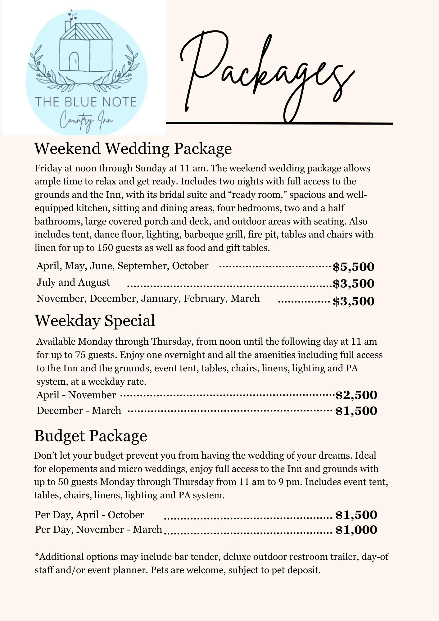 From noon on Friday to 11 am on Sunday. Full access to the grounds and the Inn. The BNC Inn provides tent, dance floor, tables, chairs, and outdoor lighting. Wedding chapel available as an add on. See details below.